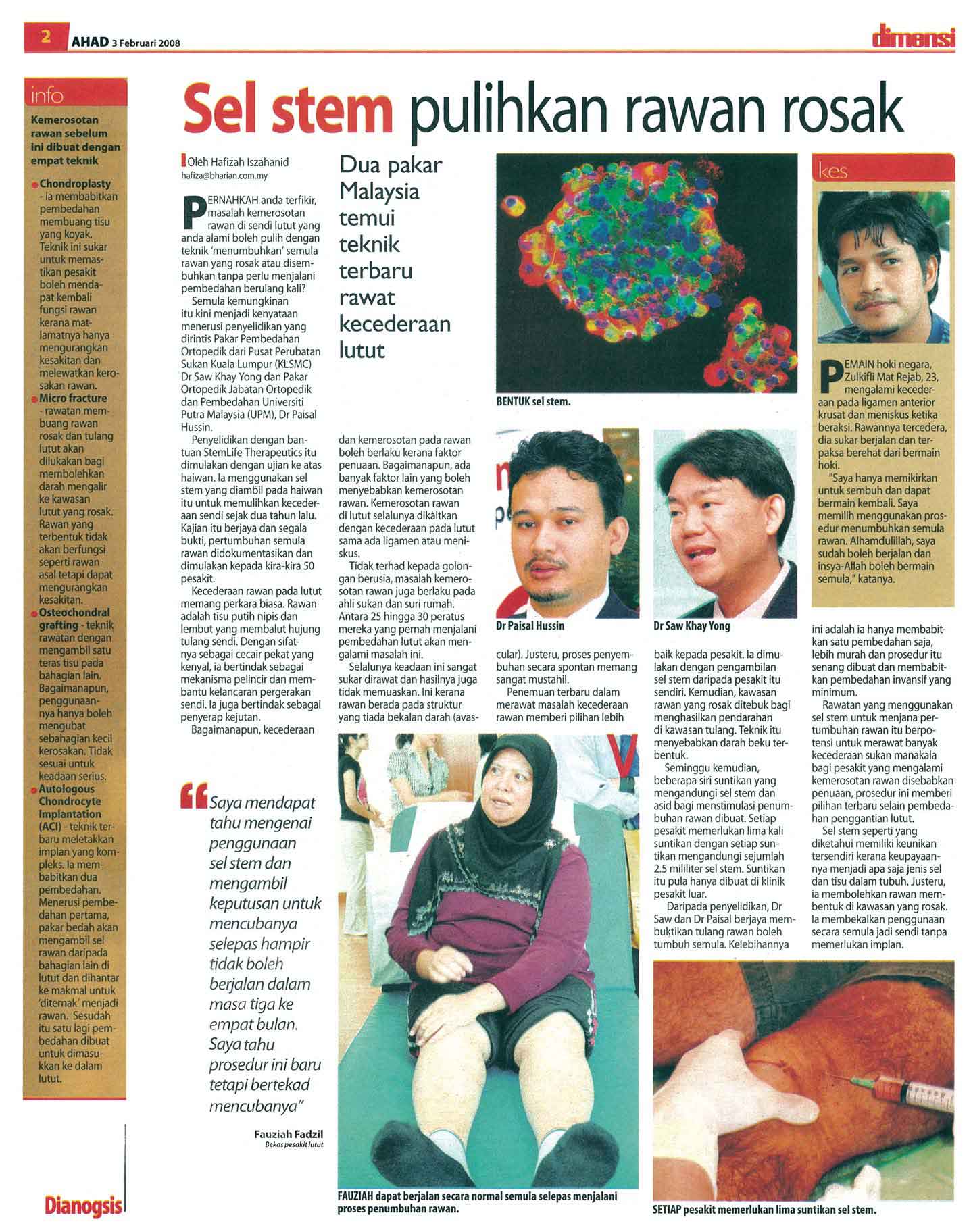 This possibility of repairing cartilage damage through cartilage regrowth without repeated surgery is now a reality with the joint research of Dr Saw Khay Yong of Kuala Lumpur Sports Medicine Centre (KLSMC) and Dr Paisal Hussin of the Orthopaedic Department, University Putra Malaysia. The article goes on to highlight the benefits of stem cell therapy.