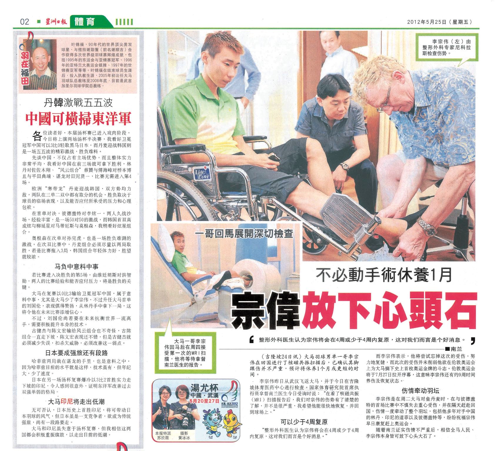 • [星洲日报] 【体育】 不必动手术修养1月 宗伟放下心头石