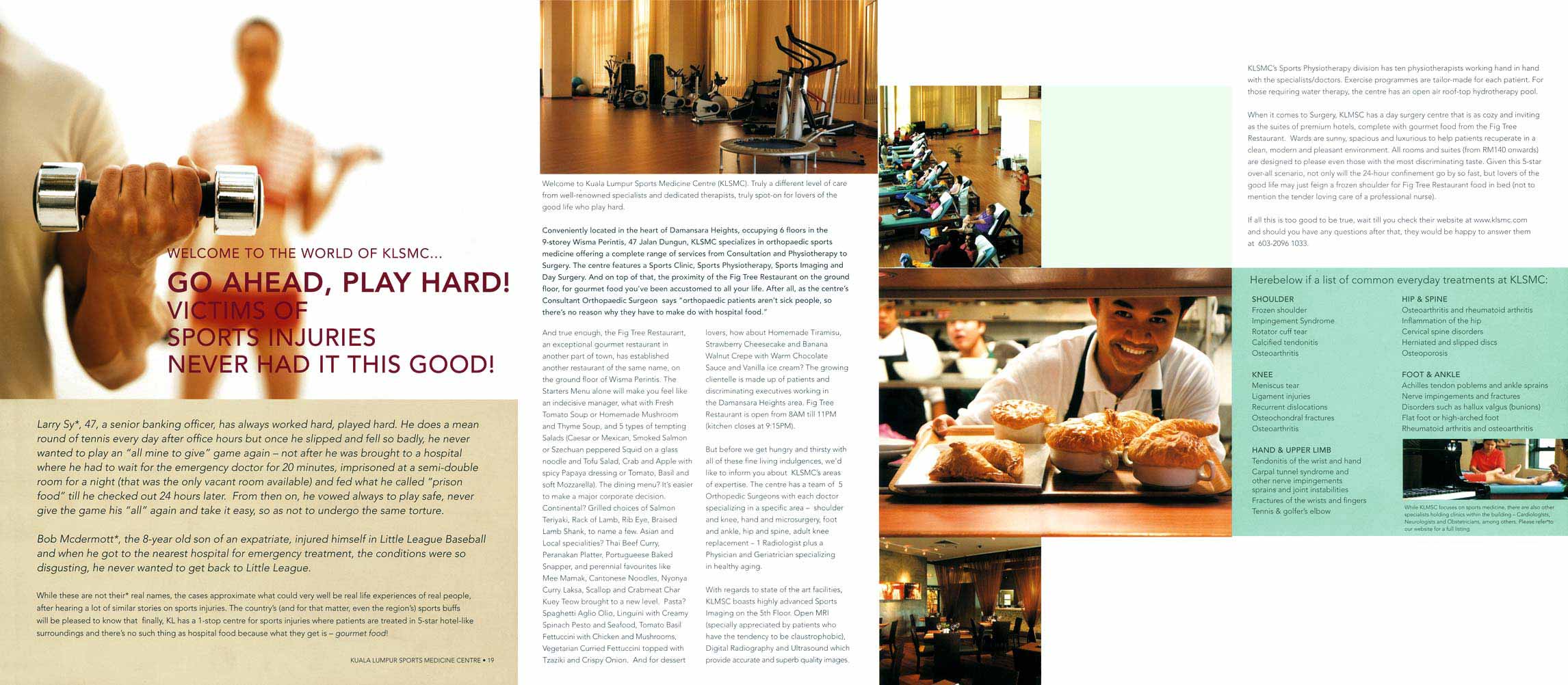 The feature article describes KLSMC and how it has become a boon to athletes and victims of sports injuries. The article goes on to describe the services, facilities and amenities offered at KLSMC including its specialties in areas of medicine concerning shoulder, hip & spine, knee, foot & ankle, hand and upper limb.
